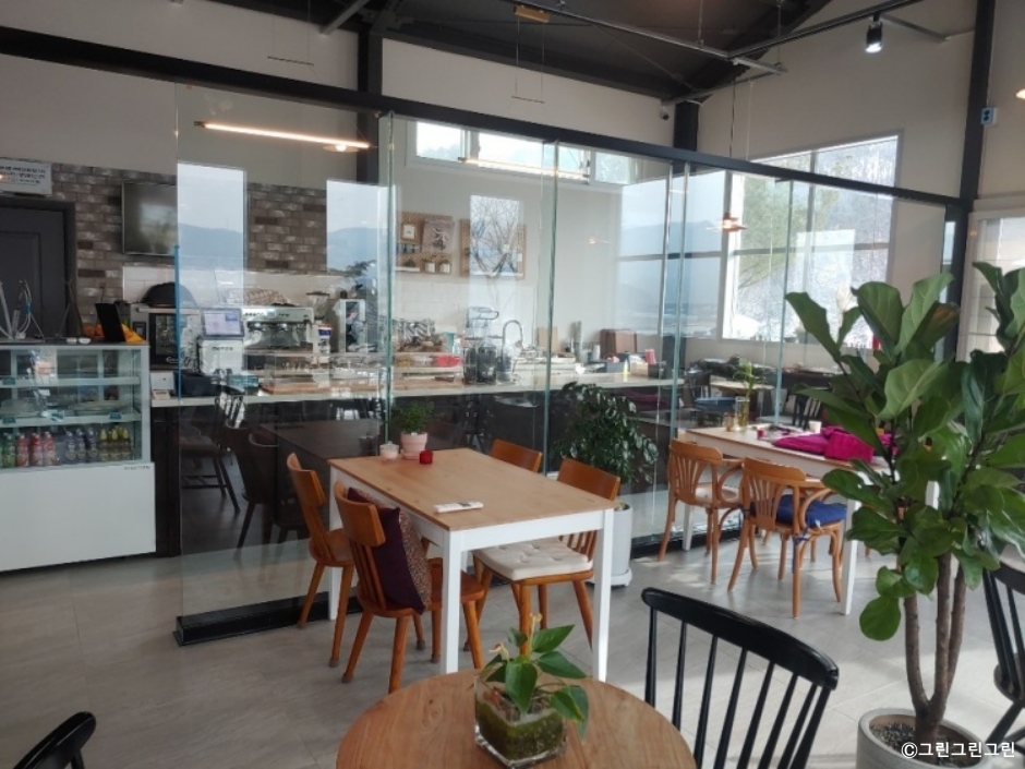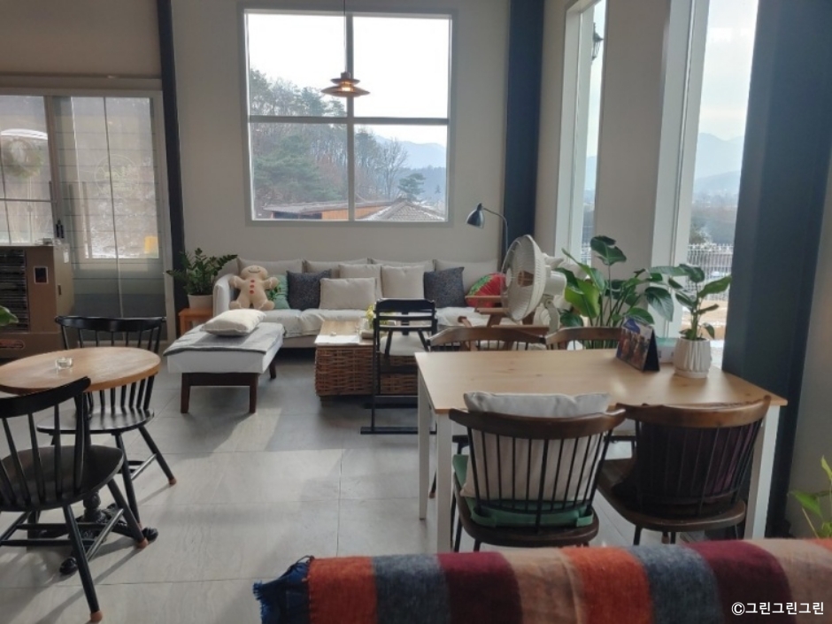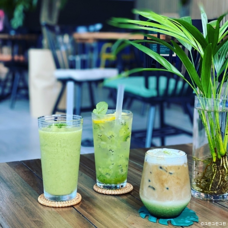 그린그린그린은 포천시 신북면에 있는 디저트 카페이다. 산, 나무, 잔디로 둘러싸인 시골 마을에 있는데 주위가 모두 초록이다. 마당에는 꽃도 많아 공기 좋고 보기도 좋다. 반려동물을 동반하면 실내에서는 하네스를 하고 있거나 안고 있어야 하고 야외에서는 풀어 놓고 있을 수 있다. 반려견이 실내를 이용할 때는 입장료를 내야하고, 지켜야 하는 규칙이 있으니 미리 확인하고 방문하는 것이 좋다. 반려동물에게도 연어랑 오리간식, 강아지 퍼푸치노 볶음밥 등 음식을 제공한다. 음료와 빵을 주문하는 공간은 반려동물이 접근하지 못하도록 분리되어 있다. 야외 공간은 2~3가지 공간으로 나누어져 반려동물들이 실컷 놀 수 있도록 준비되어 있다. 외부에는 반려견들을 위한 배변패드나 강아지 물통이 있다. 반려견을 위한 배려와 준비가 반려견 카페 수준이다. 하지만 반려동물을 동반하지 않는 손님도 많다. 자연을 감상하며 커피를 마시기도 좋은 곳이다. 시그니처 메뉴인 바닐라빈 라테가 인기가 좋다. 음료나 디저트 가격도 교외의 대형 베이커리 카페에 비해서 합리적이다. 자동차를 이용하는 손님이 많지만, 전용 주차장이 두 곳이나 있어 이용이 편리하다.