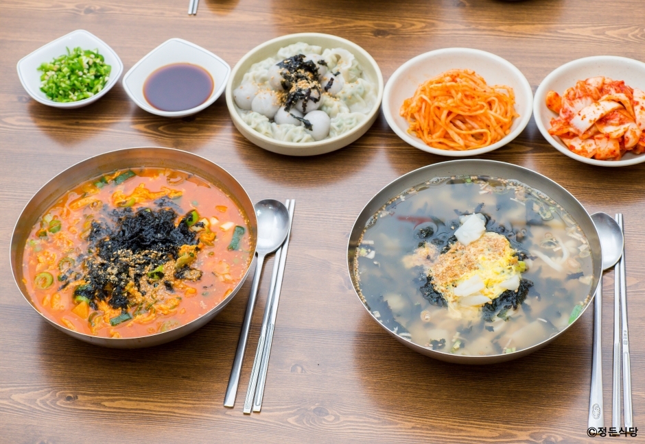 정든식당은 강원도 속초시에 있는 장칼국수 원조 식당이다. 1994년에 강원도에서 처음으로 장칼국수라는 음식을 개발해서 사업을 시작했다. 직접 반죽해서 숙성시킨 반죽을 그때 밀고, 썰고, 끓이기 때문에 음식 제공에 조금 시간이 걸린다. 장칼국수는 재래 장맛으로 국물 맛을 내고, 수타로 뽑은 면으로 꼬들꼬들하고 시원하면서도 깊은 맛이 난다. 주메뉴는 장칼국수 외에도 곁들임으로 먹을 수 있는 귀욤만두가 있다. 장칼국수 말고 다른 것을 원하는 동반자가 있다면 흰칼국수, 잔치국수, 장국밥을 주문할 수도 있다. 주차는 가게 앞이나 가게 앞 공터에 할 수 있고, 두 군데 모두 빈자리가 없으면 문화회관 옆 골목에 할 수도 있다.