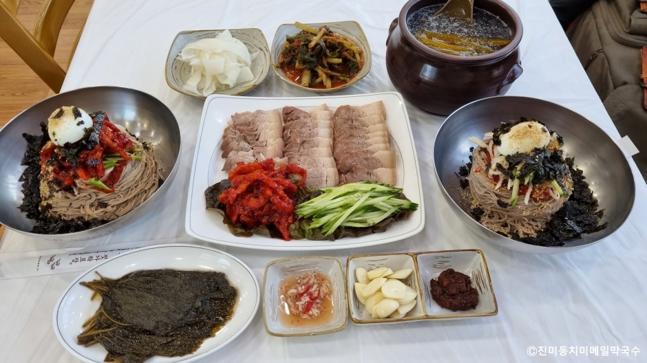 진미 동치미 메밀막국수는 강원도 속초시에 있는 막국수 전문점이다. 속초 버스터미널, 속초 해수욕장과 가까운 곳에 있다. 동해 명태회를 올린 명태회 막국수와 시원한 동치미 국물로 육수를 낸 동치미 막국수가 주메뉴이고 곁들임으로 먹을 수 있는 수육과 감자전이 있다. 자리를 잡으면 제일 먼저 시원한 동치미 한 항아리를 내놓으며 명태회 막국수는 육수를 추가할 수도 있다. 저녁 7시까지 영업하지만 재료가 소진되면 일찍 마감한다. 유동 인구가 많은 곳에 있고, 인기가 많은 식당이라 대기할 수도 있고, 주차는 매장 앞과 주변 도로를 이용할 수 있다.