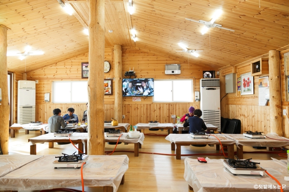 텃밭에노는닭은 강원도 삼척시에 있는 물닭갈비 전문점이다. 평일에는 강원대 학생으로 가득 차고, 평소에는 지역 주민들로 붐빈다. 명절에는 고향을 찾는 토박이들이 옛날 맛을 잊지 못하고 다시 찾아오는 곳이다. 조용하고 작은 시골 마을에 있는 식당인데도 항상 북적북적하다. 물닭갈비는 육수에 닭갈비를 끓여 먹는 음식이다. 매운맛과 순한 맛을 골라 선택할 수 있다. 주문을 하면 미나리와 깻잎이 잔뜩 올려진 닭갈비에 우동사리가 얹혀 나온다. 이곳은 사리를 처음부터 추가해야 한다. 반찬은 단무지와 무김치다. 메인 메뉴가 자극적이라 별도 반찬은 필요하지 않다. 볶음밥이 별미인데, 나중에 밥을 볶아 먹으려면 국물을 조금 남기면 된다. 주차장은 길 건너에 주차 공간이 넉넉하게 있다.