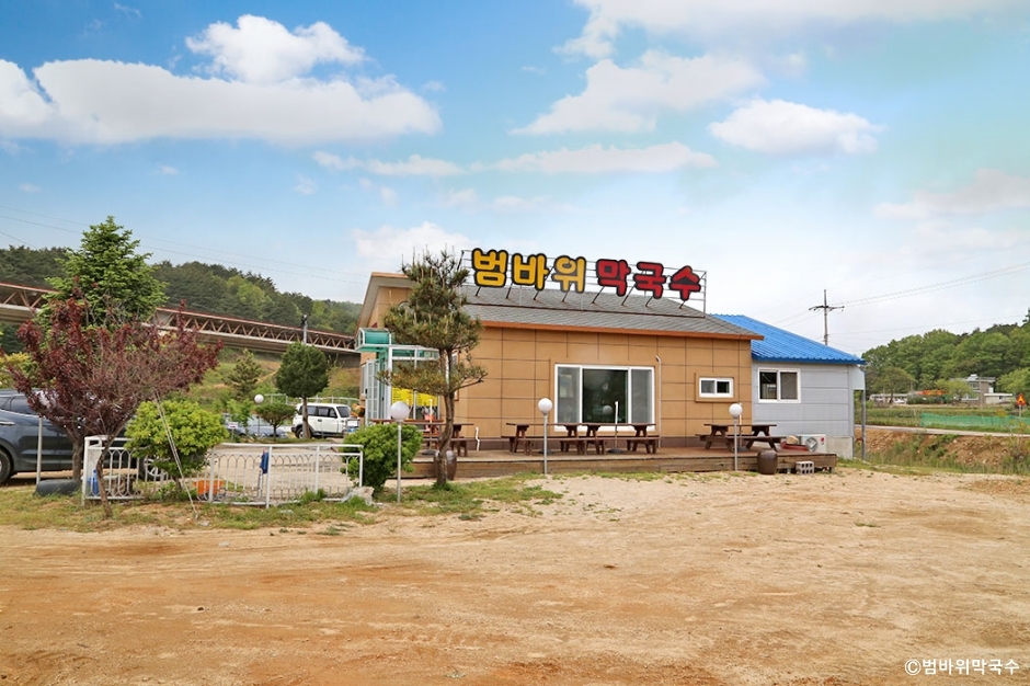 범바위막국수는 강원도 속초시에 있는 막국수 전문점이다. 척산 온천 근처에 있어 온천욕을 즐긴 후에 시원한 막국수를 먹으러 들를 수 있는 곳이다. 막국수는 주문받으면 바로 제면 해서 조리한 후 제공하고 있어 주문하고 난 후에는 변경이 어렵고 서빙까지 시간이 걸리는 편이다. 회 막국수에 올라가는 고명이 가자미회가 많은데 이 집은 대관령의 특산물인 명태회를 올려 주는 곳이다. 명태회가 막국수의 감칠맛을 더욱 높여 준다. 곁들임 메뉴로는 수육, 메밀찐만두, 찰수수부꾸미, 오징어순대가 있어 다양하게 즐길 수 있다.