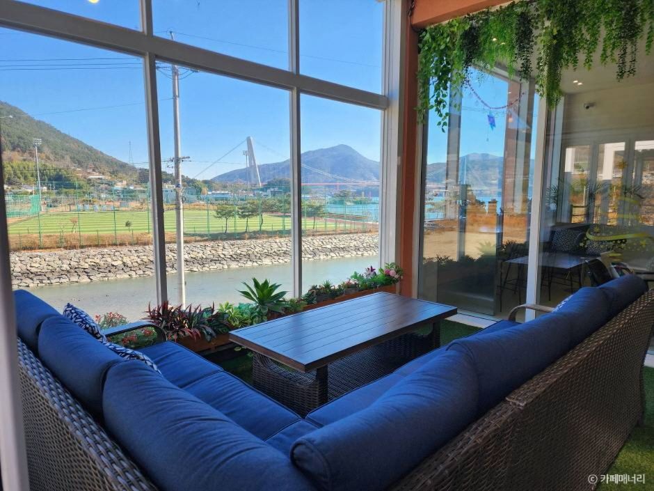 하동 주소이지만 남해 들어가는 노량대교와 남해대교와 근접해 있어 여행객들의 이용이 쉬운 위치이다. 남해대교와 노량대교 뷰를 바라볼 수 있는 바다 전망에 카페 전체 베이지 톤의 유럽 감성을 담은 멋진 인테리어와 곳곳의 소품과 작품들이 카페를 방문한 고객들에게 예쁜 사진 명소와 힐링을 안겨줄 수 있는 공간이다. 카페의 좌석들은 휴식하기에 충분한 감각적인 디자인의 아주 편안히 등을 기대고 앉아 바다를 바라볼 수 있고 산을 올려다볼 수 있도록 배치되어 있다.