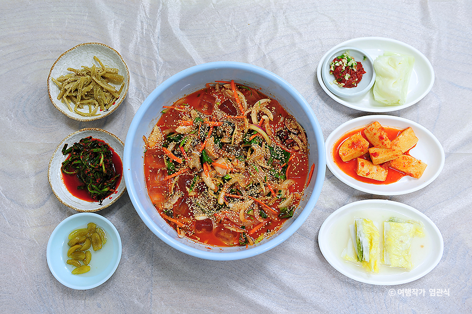 신진도 수산물 직판장 바로 뒤편에 위치한 옥양 수산은 자연산 활어를 이용한 물회가 맛있는 집이다. 그 중에서도 특히 서해안에서 흔치 않은 오징어물회를 맛보기 위해 이 집을 찾는 손님들이 많다. 옥양 식당의 오징어물회는 중매인인 남편과 일식당을 운영했던 경험이 있는 아내가 합심하여 독창적으로 만들어낸 작품이다. 먹기 좋게 채 썰어 낸 싱싱한 오징어회에 적양파와 오이, 당근, 상추, 깻잎을 채 썰어 넣고 입맛 돋우는 빨간 육수를 부은 오징어물회는 특히 더위에 지친 속을 말끔히 식혀준다. 육수의 자극적이지 않고 은은한 새콤한 맛은 직접 담근 천연 과일 식초와 매실 효소를 이용하여 만든 것. 신진도에서 잡히는 오징어는 7월부터 제철이지만 봄에는 주로 갑오징어로 물회를 만든다. 갑오징어 맛은 오징어와는 비교할 수 없이 쫀득하고 찰진 것이 특징이다.