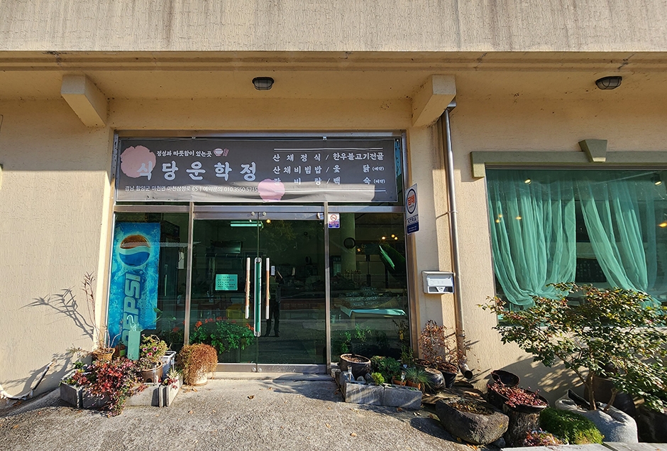 식당운학정은 건강하고 정성이 가득 담긴 정식 한상을 맛볼 수 있는 곳이다. 지리산 나물과 강화도 새우젓, 강원도 시래기, 집된장 등 국내산 재료를 사용하여 음식을 만든다. 대표메뉴는 조기와 김부각, 전, 10여 가지의 반찬이 나오는 산채정식이다. 빨간 김치와 무채 나물, 두부조림에 도라지나물, 별미인 아주 매운 고추(땡고추)와 잔멸치를 볶은 것까지 다채로운 메뉴로 시선을 사로잡는다. 단, 초등학생 이상부터 1인 1 메뉴 주문이 가능한 점, 주문과 동시에 조리가 들어가기 때문에 음식이 나오기까지 시간이 걸린다는 점을 참고해야 한다.