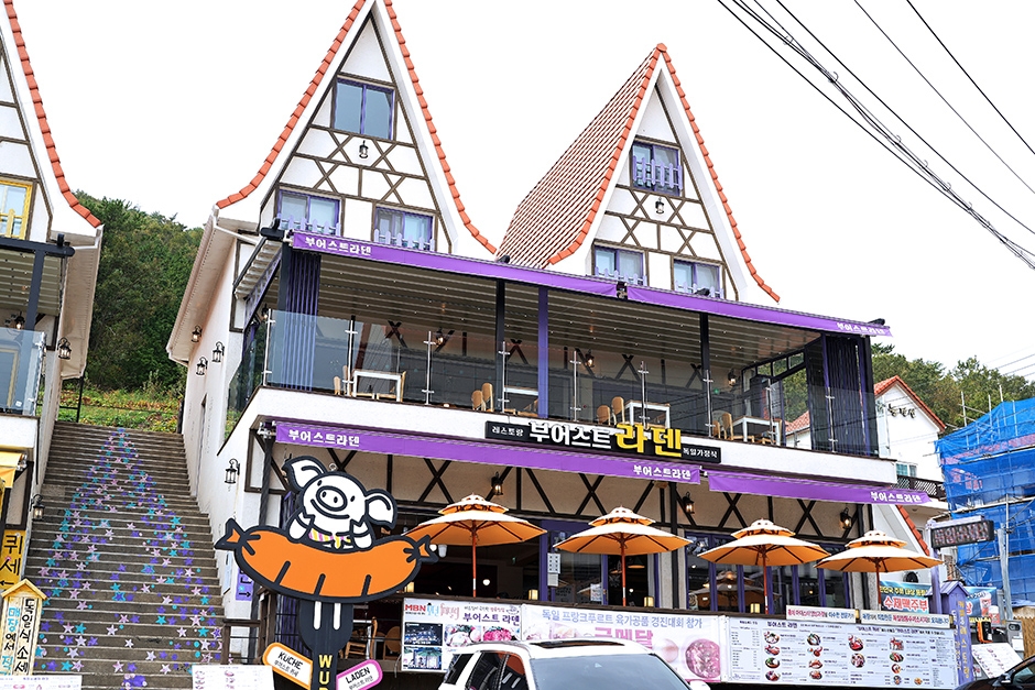 부어스트라덴은 남해 여행의 필수 코스로 꼽히는 독일 마을 초입에 있는 독일식 레스토랑이다. 독일어로 소시지 가게라는 뜻을 가진 이곳은 100% 수제 제작한 소시지로 다양한 요리를 선보인다. 대표 메뉴는 슈바이네 학센과 굴라시인데, 두 메뉴 모두 2019년 독일 프랑크푸르트 육가공 경연대회에서 금상을 받았다. 슈바이네 학센은 허브 향신료와 맥주에 24시간 염지 후 각종 채소와 함께 12시간을 삶은 후 오븐에 구워 겉은 바삭하고 속은 촉촉한 식감을 자랑한다. 굴라쉬는 독일식 소시지와 국내산 돼지고기를 올리브유, 채소와 함께 볶은 후 토마토소스에 1시간 이상 끓인 수프다. 맥주 역시 대한민국 품평회 1위 수제 맥주 공장에서 제조된 생맥주를 판매하고 있어, 진정한 독일의 식문화를 경험할 수 있다.