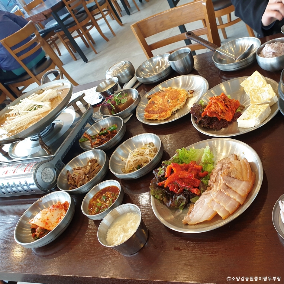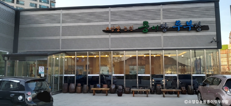 소양강농원 콩이랑두부랑은 강원도 춘천시 신사우동에 있는 두부 전문집이다. 새벽이면 우리 콩을 사용해서 가마솥에 끓여 두부를 만들고 있다. 정성껏 삶아 낸 콩과 두부를 이용해서 상에 내는 모든 음식을 만들고 있다. 두부와 콩이 맛이 있으니 음식도 당연히 맛이 좋다. 식당 내부도 정갈하고 깔끔한 인테리어이다. 차려지는 반찬도 야채와 나물은 모두 제철 재료를 사용해서 차려내고 있다. 재래식으로 두부를 만들고 있어 순두부의 양이 많이 나오지 않아 음식은 일찍 끝날 수 있다. 다양한 TV 프로그램에 소개되어 방문객이 많아 대기가 있을 수 있다. 주차는 매장 앞에 전용 주차장이 있어 편하게 이용할 수 있다.