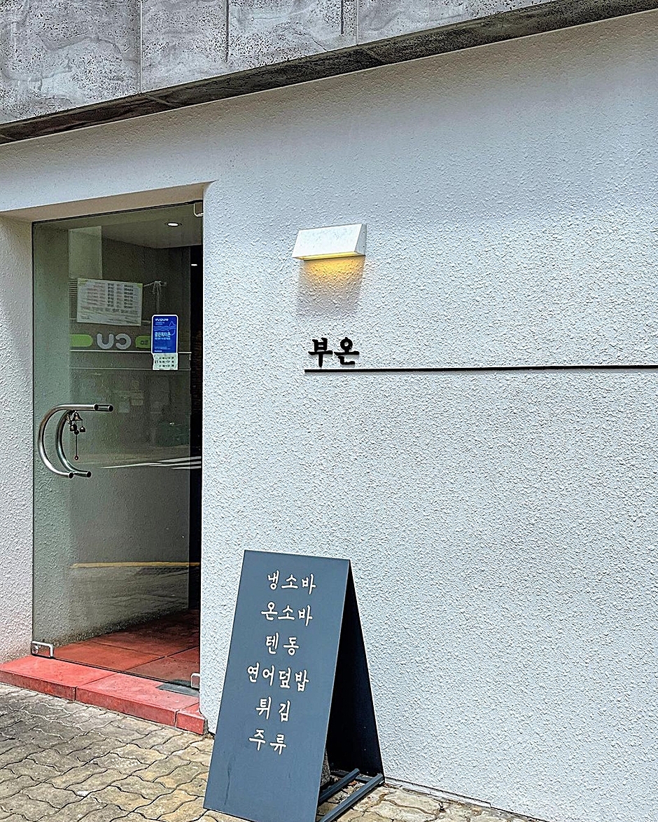 부온은 소바, 연어, 튀김을 메인으로 하는 일식당이다. 가쓰오부시와 간장류들로 48시간 동안 끓여내는 육수와 매일 아침 작업하는 생연어, 그리고 주문과 동시에 바로 조리된다. 슬로우 푸드를 지향하여 20분쯤 느긋하게 기다리는 것을 각오해야 하지만 맛집으로 소문나 있다. 튀김류는 주문이 밀릴 시 20~30분 정도 소요된다. 겨울의 대표메뉴는 싱상한 국내산 굴이 들어간 굴이 들어간 온소바이다. 기본 냉소바 위에 연어 5점이 올라간 연어 소바, 유부가 올려진 깔끔한 유부 소바, 항정살 돼지고기와 대파, 마늘을 특제 소스에 볶아내 불맛이 가득한 대파항성살소바, 부온의 노하우로 싱싱하고 야들야들한 연어가 올려진 연어덮밥 등의 다양한 메뉴가 있다.