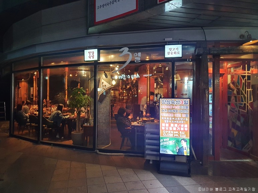 3일은 인천 1호선 인천대입구역 4번 출구 해양경찰청 앞에 있다. 주차는 매장이 있는 아파트 단지 상가 지하 주차장에 할 수 있다. 이곳은 가족끼리 외식하거나 데이트하기에도 아주 좋은 양요리 전문점이다. 3일 이상 숙성 기간을 거친 10개월 미만의 부드러운 어린 양만 취급한다. 우드톤 인테리어에 주황빛 조명으로 따뜻하고 아늑한 분위기가 느껴진다. 먼저 양고기와 곁들어 먹는 숙주가 나온다. 빨간 고추기름 소스에 숙주를 넣고 끓인 걸 양고기랑 같이 먹는다. 리필도 가능하다. 찍어 먹는 소스 4가지와 기본 반찬으로 볶음 땅콩, 무생채, 올리브가 나온다. 메뉴에는 프렌치 랙, 양 생갈비가 있다. 이외 양 생등심, 가리비 새우 버터구이, 바지락 해물짬뽕, 해물누룽지탕 등이 있다. 식당 인근에는 송도 센트럴파크, 인천상륙작전기념관, 인천시립박물관이 있어 식전 후 둘러볼 수 있다.