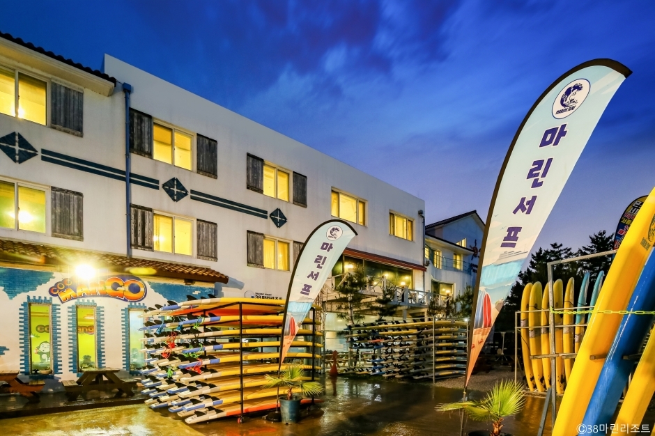 강원도 양양군 현북면에 있는 숙박업소이다. 강원도 양양군이 북위 38도선이어서 양양 지역에 38이 들어간 상호가 많이 있는데, 이곳도 상호에 38이 들어있다. 기사문 해수욕장 바로 앞에 펜션 스타일 리조트로 걸어서 약 5분 거리에 바다가 있다. 숙소 이용객에게 무료로 서핑 강습을 제공해 서핑족이 많이 찾는다. 일부 객실은 반려견과 함께 할 수 있는데 별도의 비용을 지불해야 한다. 취사는 외부 지정된 공간에서만 할 수 있으며, 분리수거는 필수이다. 별도의 바비큐 시설을 갖추고 있어, 바비큐는 그곳을 이용해야 한다. 1층에 카페 겸 식당이 있다. 주차장은 인근 공용 주차장을 이용해야 한다. 바다와 기사문 방파제의 빨간 등대가 가까이에 있어 산책하기 좋다.
