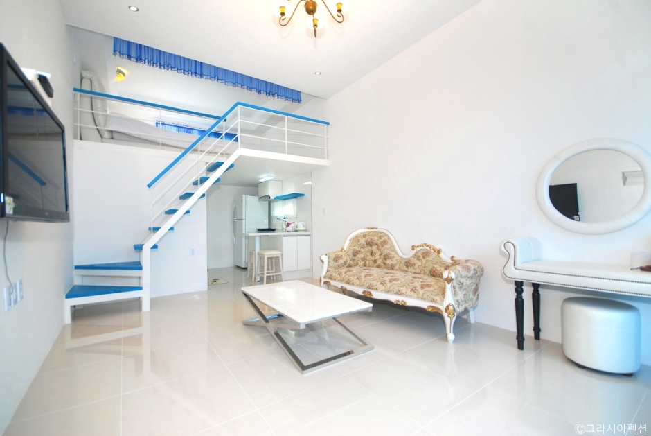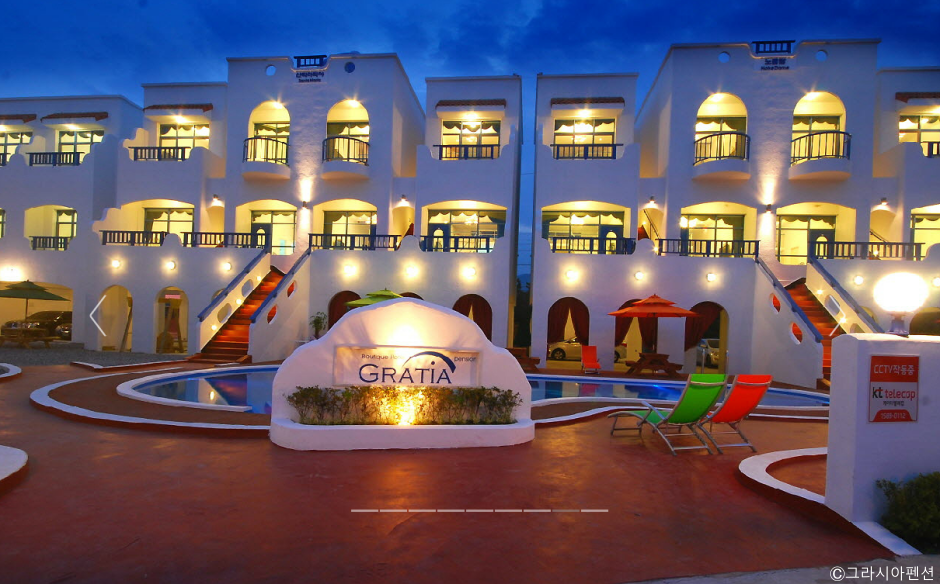 강원도 삼척시 근덕면에 있는 펜션이다. 객실 앞에 야외수영장이 있고, 주변에 파라솔과 의자가 있다. 야외수영장은 하절기에 운영하며, 한여름 뜨거운 햇빛과 파란 하늘, 빨간 파라솔, 흰색의 펜션 건물이 이국적인 분위기를 자아낸다. 밤에 건물에 조명이 들어오면 수영장 물 위로 비치는 반영은 지중해에 온 듯한 느낌을 준다. 수영장의 깊이는 약 1m이다. 모든 객실에서 바다가 바라다보인다. 도보 약 5분 거리에 편의점이 있고, 차량으로 약 10분 거리, 20분 거리에 마트가 있다. 차량으로 약 5분 거리에 궁촌항, 약 10분 거리에 장호항이 있어 항구에 있는 횟집을 방문할 수 있다. 레일바이크를 탈 수 있는 궁촌역은 걸어서 약 10분 거리에 있다. 가까이에 원평 해수욕장이 있다.