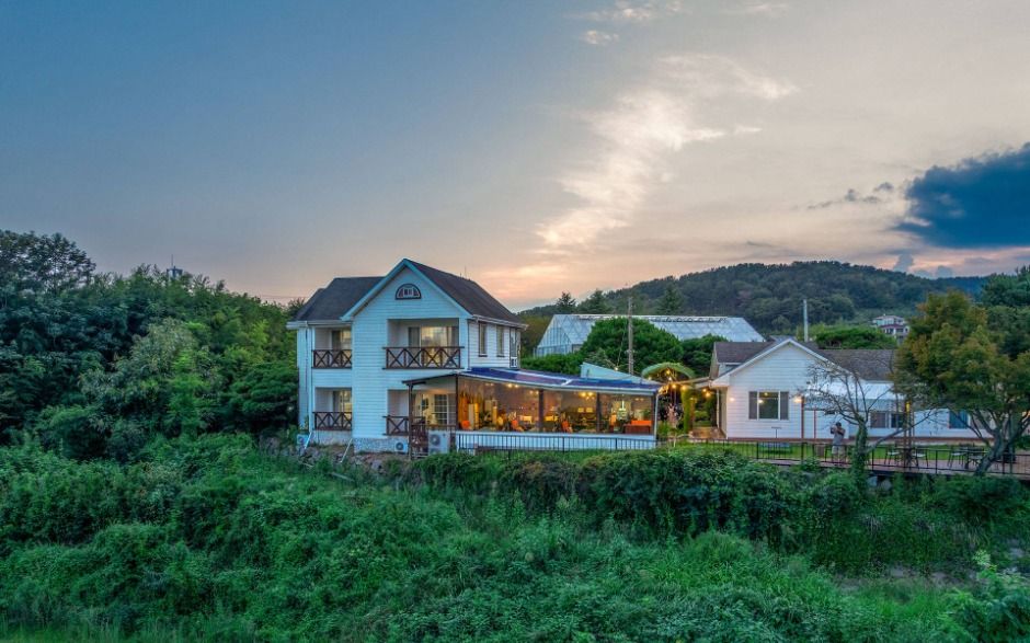 산으로 둘러싸인 잔잔한 풍광의 진양호는 명성이 높아 일찍이 진주 8경으로도 손꼽혀 왔다. 그런 그림 같은 풍광을 품 안에 두르고 있는 ‘언덕위에 하얀집’은 이름 그대로 호수를 전망하는 언덕에 하얀색의 목조 펜션이 동화처럼 서 있다. 2007년부터 영업을 시작한 이곳은 객실에서 바라보는 호수의 조망이 가장 큰 매력이다. 창이 동향으로 나 있어서 방 안에서 일출 감상이 가능하다는 점도 자랑거리다. 객실은 4개로 아담한 규모지만 족구장과 텃밭, 야외 식탁, 아기자기한 정원 등이 조화롭다. 꽃과 나무에 관심이 많은 사장님 덕분에 정원이 풍성하고, 펜션 내부에 차를 마실 수 있는 공간이 마련되어 있다. 호숫가에서는 바비큐 파티가 가능하다. 진주 시내에서 픽업 서비스도 제공한다.