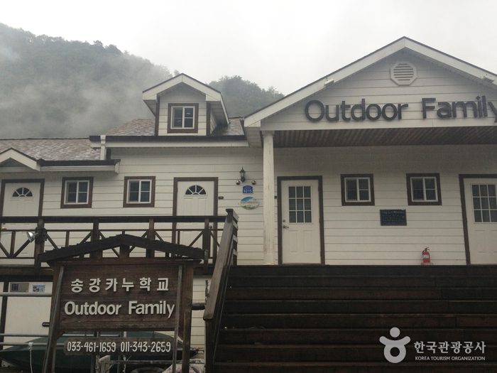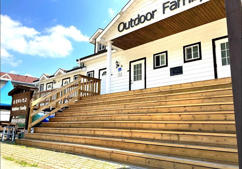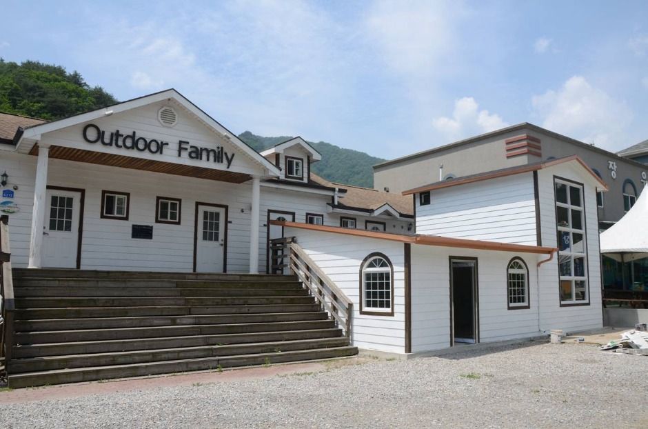 아웃도어페밀리는 캐나다산 목재로 지은 서구식 스튜디오형 펜션으로 인제읍에서 31번 국도를 따라 6km지점의 내린천 강변에 자리하고 있다. 넓은 주차장과 개별 아웃도어 매니아를 위한 게스트룸도 운영하고 있다. 객실에서는 조리와 식사도 할 수 있고 에어컨이 설치되어 있어 쾌적하게 이용할 수 있다. 객실 외부 데크에서 감상할 수 있는 내린천 경치가 일품이며 목재 내벽이 주는 목향과 습도 조절도 자연스럽게 되어 쾌적함을 더한다. 40명 이상이 동시에 앉을 수 있는 넓은 중앙계단은 단체사진 촬영 명소로도 유명하다.
