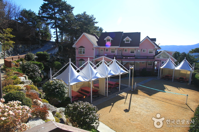 거제의 10대 명산인 북병산의 지맥이 흘러내려앉은 곳 외도, 해금강이 눈앞에 보이는 망양마을 어귀, 자연이 살아있는 이곳에 팔색조와 같은 예쁜 집을 지어 이름을 팔색조라 하였다. 약 200평의 잔디마당, 연못, 그리고 족구, 배구, 배드민턴 등 다양한 운동을 할 수 있도록 다목적 구장을 준비하였으며, 약 20평의 카페식 홀은 이벤트나 노래방으로 사용할 수 있도록 하였다.