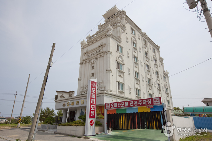 오페라모텔은 돌산대교를 건너 여수 제3 청사 근처에 위치한다. 건물의 외관은 흡사 중세 유럽의 건축물처럼 웅장하고 화려하게 되어 있어, 지나는 이들이 한 번쯤 돌아볼 만하다. 객실은 모두 화려한 색감이 돋보이는 인테리어로 꾸며져 있고, 특히 침대머리 부분을 빌로드 느낌으로 꾸민 벽이 인상적이다. 세련된 인테리어 감각이 돋보이는 특실은 침실과 거실을 시각적으로 분리하는 나무 기둥이 있어 한층 돋보인다. 오페라모텔을 오기 위해 건넌 돌산대교는 드라이브 코스로도 유명하고, 근처에 방죽포 해수욕장이 있어 여름 피서철에 인기가 좋고, 동백꽃으로 유명하다.
