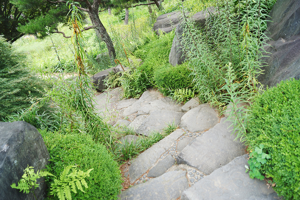 자라난 소나무들과 어우러진 잘 가꾼 정원을 거니는 느낌을 받습니다.