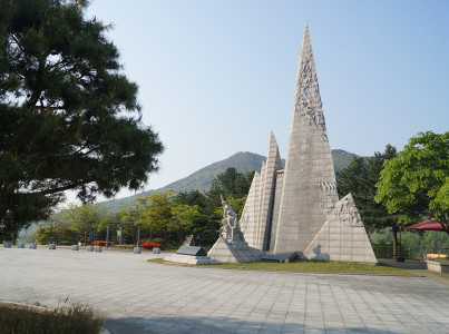 아지매입니다. 오늘은 관광지는 아니지만 잊지는 말아야 할 곳을 알려드릴께요~ 노근리 쌍굴다리와 노근리 평화공원입니다. 쌍굴다리에는 지금도 총탄 흔적이 남아있어 그날의 상황을 말해주고 있습니다. 노근리 사건은 한국전쟁 초기인 1950년 7월 25일부터 7월29일까지 충북 영동군 영동읍 하가리와 황간면 노근리의 경부선 철도 아래 쌍굴일대에서 미 공군기에 의해 공중폭격과 소속 미군들의 무차별적인 사격의 의해 수백 명의 무고한 양민들의 희생된 사건입니다. 노근리 쌍굴 교각은 1950년 7월26일~29일까지 4일간 후퇴하던 미군이 주민들을 굴다리 안에 모아 놓고 집단학살을 자행하였던 현장입니다. 당시 피난민들이 쌍굴을 통과하여 이동하는 모습을 재형한 부조와 양쪽으로 시공을 초월하여 고인들과 참배객들을 연결하는 교감의 통로인 '교감의 문' 참배객들의 이미지를 투영하여 고인들과 후손들이 교감한다는 의미를 담고 있는 '추모의 상'입니다.