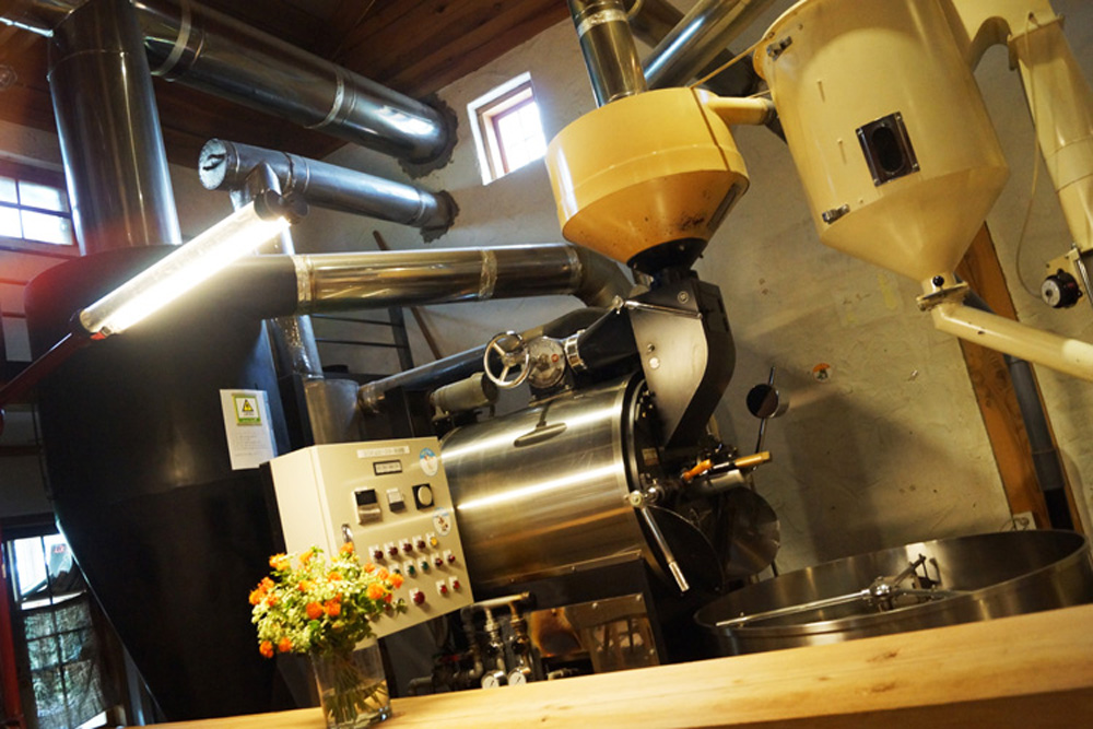 포대가 차곡차곡 쌓여있고 한쪽에는 커피를 로스팅하는 대형 기계가