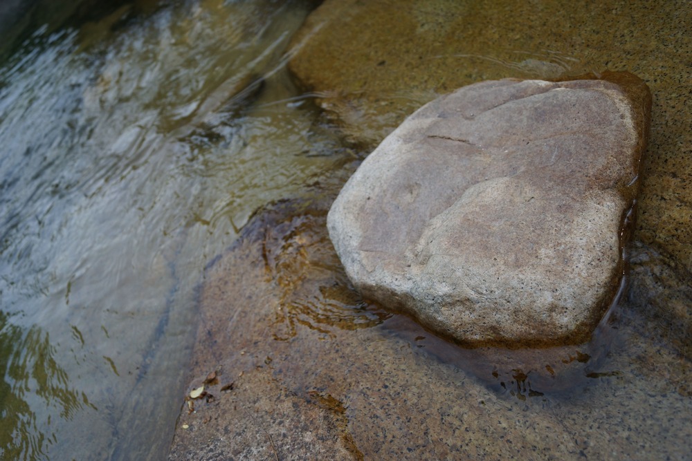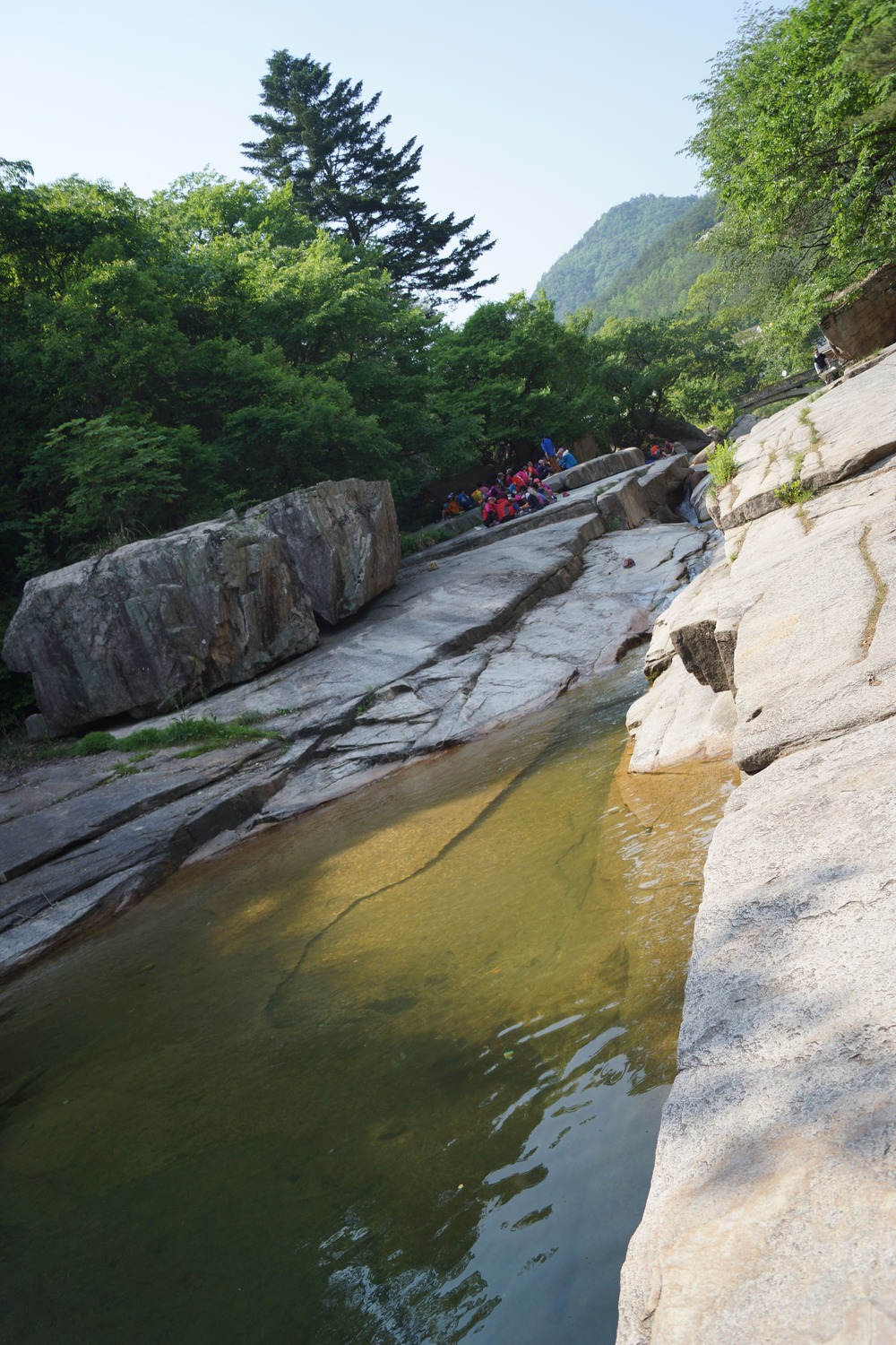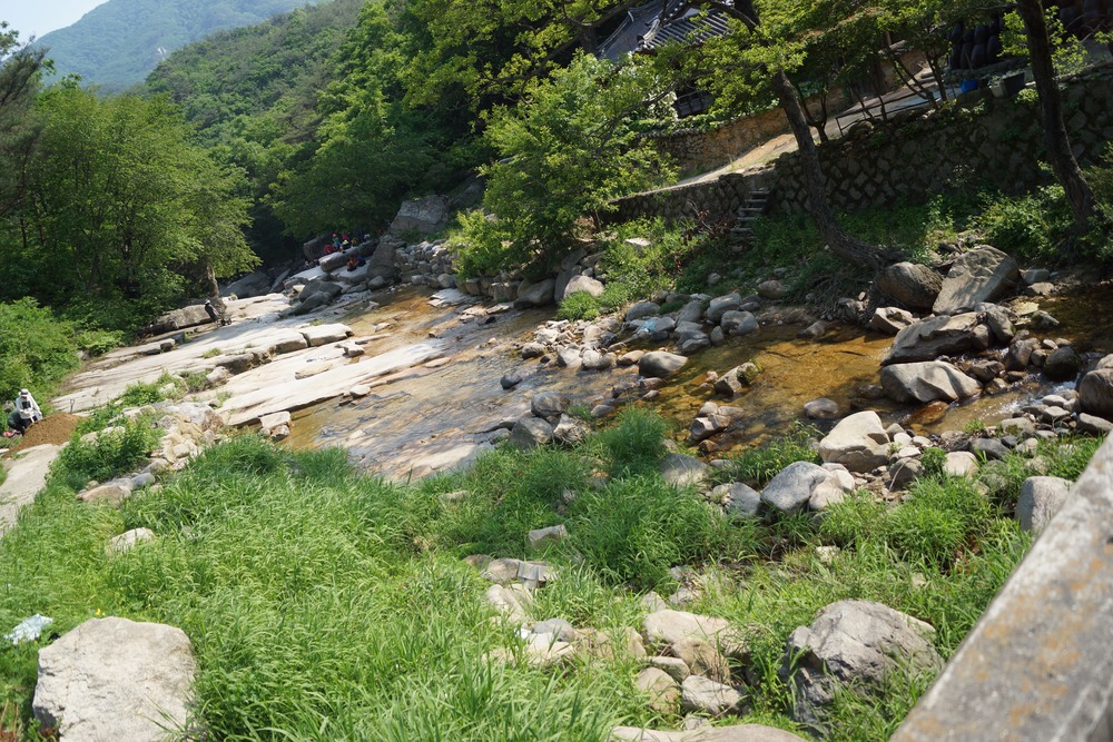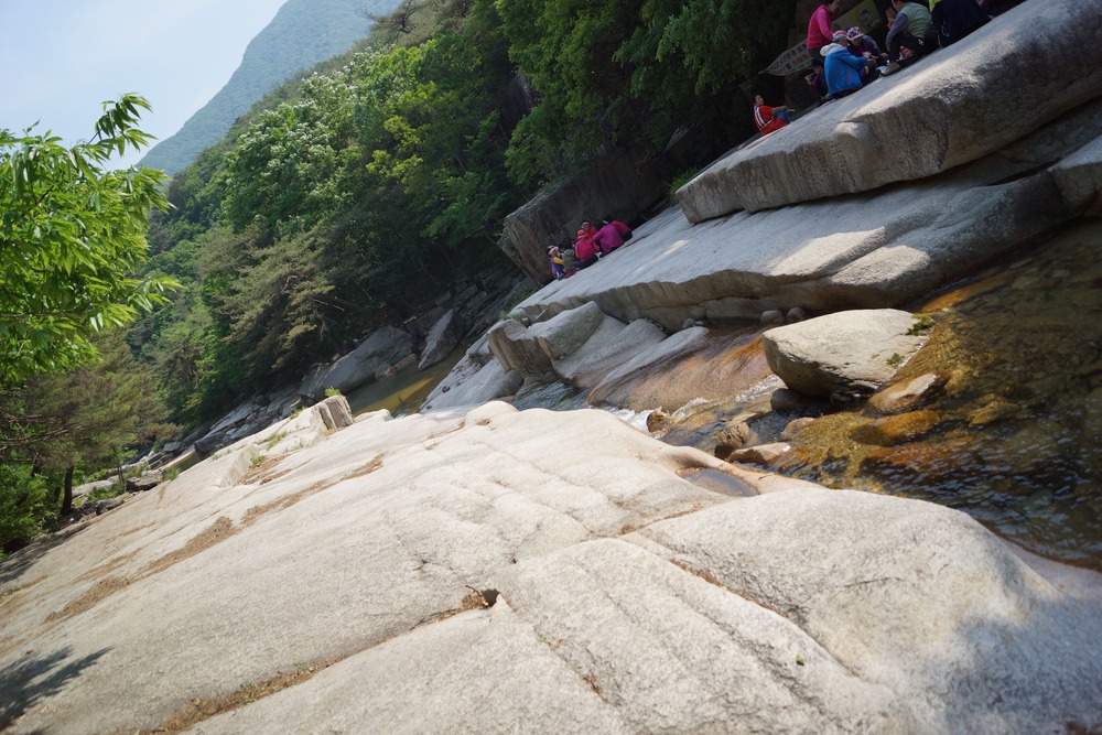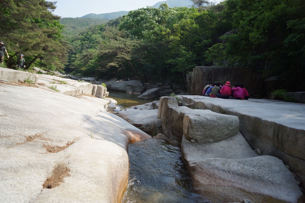 맑은 물들이 평탄한 바위 사이로 흐르는 것을 보니