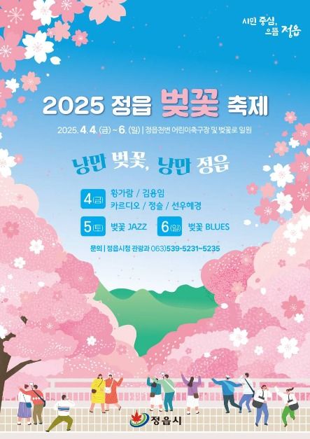 - 정읍 벚꽃축제는 1991년부터 개최되어온 전통 있는 행사로, 올해 정읍 벚꽃축제는 2025년 4월 4일부터 4월 6일까지 3일간 개최된다. 축제 장소는 정읍천 벚꽃로이며, 정읍천 어린이축구장 일원에서 진행된다. 축제 시간은 오전 10시부터 오후 10시까지이다. 축제의 주요 프로그램은 개막식 및 축하공연, 시립 농악단 공연, 벚꽃 요가, 벚꽃 플로깅 등이다. 부대 프로그램으로는 먹거리 부스, 체험 부스, 농특산물 판매 부스 등이 운영된다. 축제 기간 동