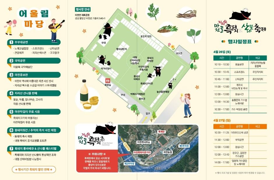 - 지리산 마천골 흑돼지&산나물 축제는 2015년 제1회 돼지감자&흑돼지축제를 시작으로, 2025년 제7회째를 맞이하고 있으며, 마천면의 특산물인 흑돼지와 산나물을 주제로 국립공원 제1호인 지리산이 소재하고 있는 마천면 생활체육공원에서 개최된다. 함양군 마천면은 청정 산골지역으로, 예로부터 옻순, 고사리, 두릅 등 산나물 및 벌꿀이 많이 생산되며, 이번 축제에는 마천 흑돼지와 산나물을 동시에 맛볼 수 있고, 각종 산나물의 조합인 대형비빔밥 퍼포먼스, 흑돼지
