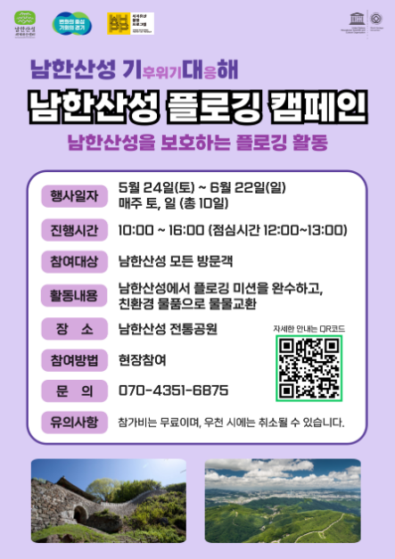 - 2025 세계유산 남한산성 활용프로그램은 남한산성 행궁에서 다양한 전통문화 체험을 통해 역사적 의미를 되새기고 교육적 가치를 높이는 상설 프로그램인 행궁교육체험, 참가자가 남한산성 성곽을 돌며 남한산성을 지키는 수어사가 되어보는 스토리텔링 체험 프로그램인 OUV 탐험대, 세계유산 남한산성을 기후위기로부터 보호하고, 보존의 중요성을 배우는 기후위기 대응 프로그램인 남한산성 기대해로 진행된다.