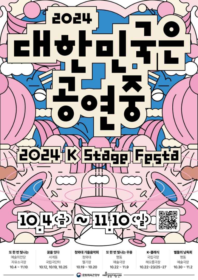 올해 처음 선보이는 〈2024 대한민국은 공연중〉은 공연 최성수기인 10월에 열리는 주요 공연예술 행사와 전국 곳곳에서 진행되는 공연을 연계하여 소개하는 통합 공연예술축제이다. 국립극장, 예술의전당, 명동예술극장, 청와대, 서계동 옛 국립극단 터에서 대표 공연을 선보이며, 주요 공연예술 행사인 서울아트마켓, 서울국제공연예술제, 웰컴대학로 등 국내외 공연예술 및 공연관광 분야를 확인할 수 있다. 더불어 전국 문예회관과 공연장에서 진행하는 다양한 공연을 대