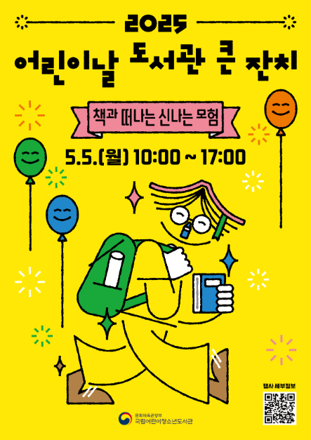 '어린이날 도서관 큰 잔치'는 국립어린이청소년도서관이 매해 개최하는 어린이날 행사로, 어린이가 주체가 되어 온가족이 함께 즐길 수 있는 독서문화 프로그램이다. 올해는 '책과 떠나는 신나는 모험'이라는 주제로 어린이들이 책을 통해 새로운 세계를 경험하고 상상력을 키워나가도록 기획되었다. 해당 행사에서는 어린이들이 자신의 감정과 마음을 책 속의 얼굴을 통해 나누고 표현하는 '나를 닮은 책 속의 얼굴' 공모전 시상식도 열리며, 책을 원작으로 한 OST 콘서트와 어린이 인형극, 그림책 작가와 함께하는 그림책 감상 및 만들기 활동, 어린이가 직접 참여하는 도서관 골든벨 및 팝업북 만들기 등 책 속 이이기와 상상을 살아 숨 쉬는 경험으로 만들어줄 다채로운 프로그램이 가득하다.