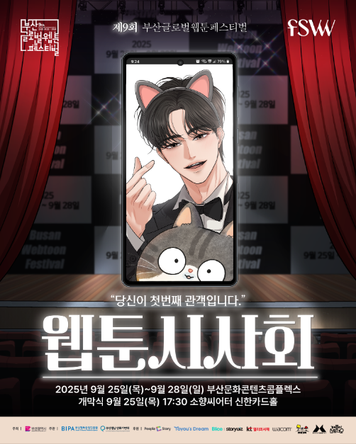 제9회 부산글로벌웹툰페스티벌은 2025년 9월 25일부터 9월 28일까지 부산문화콘텐츠콤플렉스에서 열리는 국내 대표 웹툰 축제이다. 올해는 ‘웹툰 시사회’라는 새로운 콘셉트로 진행되며, 아직 공개되지 않은 신작 웹툰을 누구보다 먼저 접할 수 있는 기회를 제공한다. 개막식은 9월 25일 오후 5시 30분 소향씨어터 신한카드홀에서 진행된다. 다양한 프로그램과 특별 전시, 체험형 콘텐츠가 준비되어 있어 웹툰 팬뿐 아니라 창작자와 업계 관계자 모두에게 의미 있