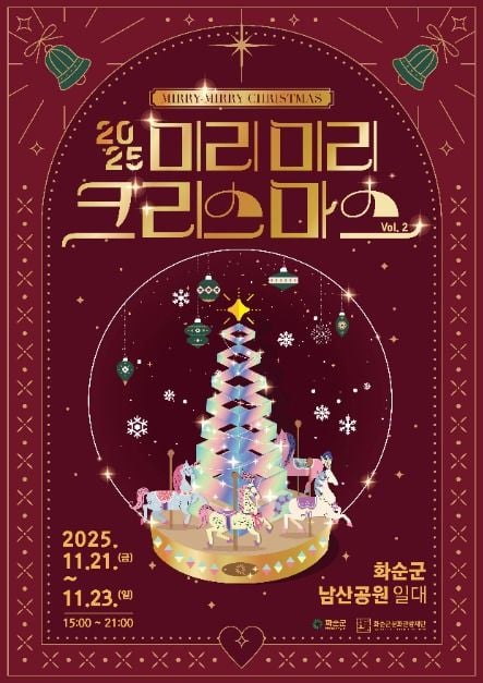 - '2025 미리미리 크리스마스 Vol. 2'가 11월 21일부터 23일까지 화순 남산공원과 고인돌 전통시장 일대에서 펼쳐진다. 크리스마스 마켓과 마칭밴드 퍼레이드, 와글와글 밤시장, 클래식 회전목마, 가족 체험 프로그램 등 다채로운 즐길 거리가 준비되어 있어, 온 가족이 함께 겨울의 설렘과 크리스마스 분위기를 미리 경험할 수 있는 축제이다.