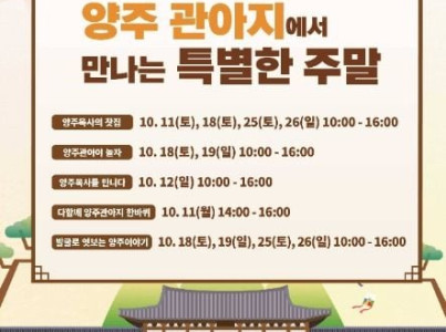 양주시는 지역의 역사적 가치를 시민과 공유하고 문화유산을 친근하게 체험할 수 있도록 「양주관아지에서 만나는 특별한 주말」 프로그램을 운영한다. 이번 프로그램은 전통과 현대가 조화를 이루는 다채로운 체험과 공연으로 구성되어 주말을 맞아 가족, 친구, 연인 등 다양한 계층이 함께 즐길 수 있는 열린 문화마당이다. 주요 내용으로는 전통놀이와 한복 체험, 전통 공예 만들기 등 참여형 전통문화 체험과 양주관아지 해설 투어, 독립운동 이야기 등 역사적 가치를 되새기는 해설 프로그램이 마련되어 있다. 또한 전통연희 공연과 지역 예술가들의 무대가 함께 어우러져 관람객에게 다채로운 볼거리를 제공한다. 이와 함께 어린이와 가족 단위 방문객을 위한 맞춤형 체험도 준비되어 있어 누구나 즐길 수 있다. 시는 이번 프로그램을 통해 시민들이 문화유산의 의미를 직접 체험하고, 양주관아지의 역사적 정체성을 더욱 가까이 느낄 수 있는 계기가 될 것으로 기대하고 있다.
