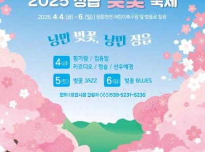 정읍 벚꽃축제는 1991년부터 개최되어온 전통 있는 행사로, 올해 정읍 벚꽃축제는 2025년 4월 4일부터 4월 6일까지 3일간 개최된다. 축제 장소는 정읍천 벚꽃로이며, 정읍천 어린이축구장 일원에서 진행된다. 축제 시간은 오전 10시부터 오후 10시까지이다. 축제의 주요 프로그램은 개막식 및 축하공연, 시립 농악단 공연, 벚꽃 요가, 벚꽃 플로깅 등이다. 부대 프로그램으로는 먹거리 부스, 체험 부스, 농특산물 판매 부스 등이 운영된다. 축제 기간 동안 차 없는 거리가 운영되며, 샘골다리에서 달하다리까지 운영되며, 교량은 차량 통행이 가능하다. 축제의 입장료는 무료이나 일부 유료 프로그램이 포함되어 있다. 주차는 정읍천 무료주차장을 이용할 수 있으며, 유료 주차장으로는 샘고을시장 평화주차장, 시기 도심 공영주차장, 시기 노상 공영주차장 등이 있다.