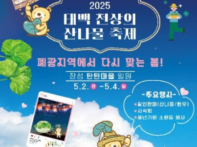 향긋한 봄을 맞이하여 산나물 제철을 맞은 태백 산나물이 오는 5월 2일부터 5월 4일까지 3일간 태백 장성탄탄마당(장성중앙시장) 일원에서 개최된다. 해발고도가 높은 지역에서 재배되어 맛과 향이 진한것이 특징인 태백산나물을 할인된 가격으로 만나볼 수 있으며, 축제기간동안 다양한 공연, 먹거리, 경연, 체험행사 및 야시장, 프리마켓 등을 즐길 수 있다.