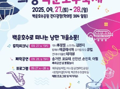 의왕백운호수축제는 아름다운 자연경관을 자랑하는 백운호수를 배경으로 매년 가을 열리는 지역 대표 문화축제이다. 이 축제는 의왕시민은 물론 외부 관광객들에게도 큰 사랑을 받고 있으며, 자연과 예술, 문화가 어우러진 다채로운 프로그램으로 구성되어 있다. 특히 이번 축제는 새롭게 단장된 백운호수공원 잔디광장에서 자연을 더욱 가까이 느낄 수 있는 공간에서 펼쳐진다. 백운호수의 풍경 속에서 열리는 유명 가수의 음악 공연, 유·무료 체험 프로그램, 버스킹, 각종 이벤트, 음식 마당 등은 남녀노소 모두가 즐길 수 있는 다양한 즐거움을 선사한다. 또한 지역 예술인과 주민들이 함께 참여하여 공동체의 소통과 화합을 도모하는 축제로 자리매김하고 있다. 도심의 일상에서 벗어나 자연 속에서 여유와 문화를 동시에 누릴 수 있는 의미 있는 행사이다.