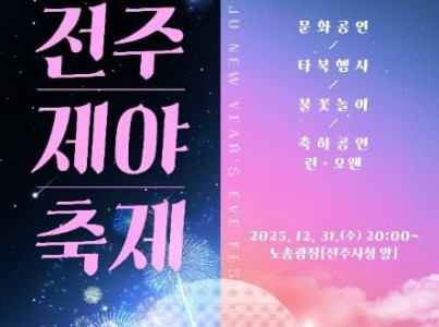 전주의 한 해를 따뜻하게 마무리하는 대표적인 연말 축제로,전통의 멋과 현대적 감성이 어우러진 다채로운 볼거리와 즐길 거리를 선보인다. 지역 예술인과 시민들이 함께하는 1부 문화공연을 시작으로, 2부에는 삼산과 모던국악프로젝트 차오름이 선보이는 조선팝 무대,퓨전엠씨의 화려한 브레이킹 퍼포먼스,그리고 린, 오왠이 준비한 따뜻한 겨울 감성 무대까지 풍성하게 펼쳐진다. 가족·연인·친구 누구나 참여할 수 있는 다양한 체험 프로그램과 2026년 새해의 시작을 알리는 타북행사, 불꽃놀이도 함께 준비되어 있어 전주의 마지막 밤을 더욱 특별하게 만들어준다. 다채로운 공연과 체험이 어우러진 전주 제야축제에서 2025년의 마지막 순간을 모두 함께 즐길 수 있다.