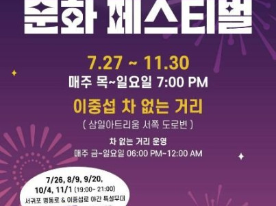 '2025 서귀포 원도심 문화페스티벌’은 서귀포 이중섭로에서 펼쳐지는 야간 문화공연이다. 화려한 조명 아래 음악, 댄스, 퍼포먼스 등 다양한 장르의 공연이 관객들들에게 다양한 볼거리를 제공한다. 일상에서 벗어나 예술과 여유가 어우러진 특별한 추억을 남기고 싶은 이들에게 적극 추천하는 행사이다. ‘2025 서귀포 원도심 문화페스티벌’은 7월 27일부터 매주 목~일요일 저녁 7시에 운영되며, 11월까지 이어진다. 서귀포 원도심의 감성적인 밤, ‘2025 서귀포 원도심 문화페스티벌’이 당신을 기다리고 있다. 단, 기상악화 및 우천시 공연이 취소될 수 있으니 사전에 문의하길 바란다.