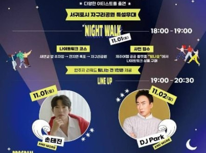 제주특별자치도와 제주특별자치도관광협회는 11월 1일(토)부터 2일(일)까지 2일간 서귀포 원도심 일대에서 「2025 원도심 야간여행 섬夜시즌」 축제를 개최한다. 이번 축제는 제주 원도심 야간관광 콘텐츠 개발로 관광객 유입을 통한 주변 상권 활성화를 목적으로 기획되어, 제주의 선선한 가을 청취를 느끼며, 다채로운 공연 및 이벤트 마련으로 가족, 친구, 연인과 함께 소중한 추억을 만들 수 있는 기회를 제공한다. 특히, 축제 첫날(11월 1일) 일상의 분주함을 잠시 내려놓고, 고즈넉한 밤 속 자연과 교감하며 걷는 「섬夜 나이트워크」가 개최되며, 코스는 서귀포항과 새섬을 연결하는 밤바다 랜드마크 새연교 산책로와 울창한 수림, 야간 조명으로 밝혀진 천지연 폭포, 도심 속 쉼터 자구리공원을 돌아보는 순서다.
