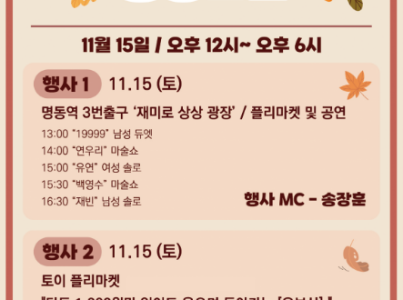 '가을, 명동으로'는 즐거움과 의미가 함께하는 행사이다. 명동역 3번 출구 앞 ‘재미로 상상 광장’에서 신나는 음악과 퍼포먼스가 어우러진 멋진 공연이 이어지며, 현장을 찾은 모든 이들에게 풍성한 볼거리를 제공한다. 공연과 함께 열리는 토이 플리마켓에서는 다양한 장난감과 굿즈를 직접 보고 구매할 수 있어, 어린이와 어른 모두 즐거운 시간을 보낼 수 있다. 행사 중간 중간 준비된 경품 이벤트는 참여자들에게 특별한 즐거움을 선사한다. 특히 토이 플리마켓의 수익 일부는 장난감이 필요한 어린이에게 기부되어, 방문객들이 즐거움을 누리는 동시에 의미 있는 나눔을 실천할 수 있다. 가족, 친구, 연인과 함께 가을의 정취 속에서 즐거운 추억을 만들 수 있는 뜻깊은 행사이다.